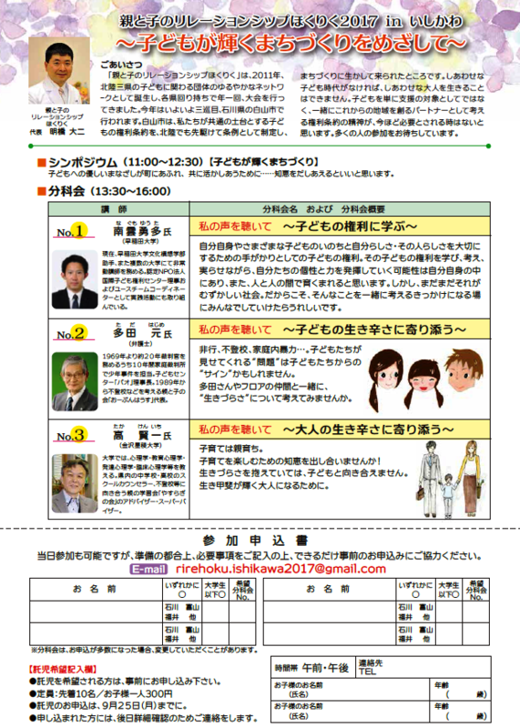 2017/09/23「親と子のリレーションシップほくりく」は、「子どもの権利条約フォーラム2009 in とやま」をきっかけに結成されたネットワークで、2011年6月に金沢市において、北陸3県で親と子供に関わる団体が集まり、発足集会が開催されました。